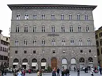El Palacio Uguccioni fue construido por Giovanni Uguccioni a partir del 1550 de Mariotto di Zanobi Folfi. La arquitectura original de formas clásicas presenta afinidades con el estilo tardío del renacimiento romano, que han hecho pensar en un diseño de Rafael o de Miguel Ángel. El efecto decorativo de la fachada del palacio se relaciona con la reestructuración de la Plaza de la Señoría realizada por Cosme I de Médici. Por intercesión del granduque el Uguccioni obtiene el poder de construir su propio palacio, más elevado que los adyacentes. En la primera planta ha colocado dos tipos sobrepuestas de columnas dóricas dobles. En lo alto del pedestal de las columnas han sido finamente esculpidas las insignias y escudos de la familia.
