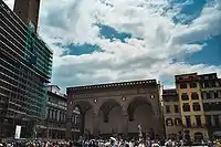 La logia, galería o pórtico (loggia) de la Señoría, llamada también Loggia dei Lanzi (porque aquí acamparon los Lanzichenecchi en el año 1527) o la logia de los Orcagna (por una errada atribución al hermano del arquitecto proyectista), fue construido entre los años 1379 y 1381 por Benci di Cione (hermano de Orcagna) y por Simone di Francesco Talenti. Desde el punto de vista arquitectónico la construcción une elementos del gótico, como las pilastras en la fachada y el coronamiento, con elementos de matriz clásica como los grandes arcos.