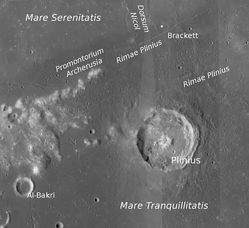 Plinius es un destacado cráter de impacto de la Luna situado en la frontera entre el Mare Serenitatis, al norte, y el Mare Tranquillitatis, al sur. Al sur-sureste de Plinius se encuentra el cráter Ross y al noreste el cráter Dawes. Justo al norte se localiza un sistema de rimas denominado Rimae Plinius. En el extremo noroeste de la rima se halla el Promontorium Archerusia, un saliente del borde occidental que rodea al Mare Serenitatis.