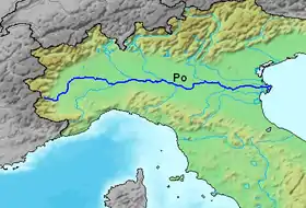 El río Po [pɔ] (en latín: Padus; en griego antiguo: Πάδος y Ἠριδανός', Pádos y Eridanós; en celta antiguo: Bodinkòs o Bodenkùs) es un largo río de la Italia septentrional que fluye, de oeste a este, desde los Alpes cocios al mar Adriático, donde desemboca en un amplio delta cerca y al sur de la ciudad de Venecia. Tiene una longitud de 652 km —o 691 km considerando el sistema Po-Maira, un afluente de la margen derecha[nota 1]—, que lo convierten en el río más largo íntegramente por territorio italiano.[nota 2] Drena una cuenca hidrográfica de 74 000 km², de los que unos 71 057 km² son territorio italiano,[4] un cuarto del país —41 000 km² en unos entornos montañosos y 29 000 km² en llanura[5]—, siendo por ello la mayor cuenca italiana (el resto de la cuenca es territorio suizo y francés). También es el río italiano más caudaloso —ya sea por caudal mínimo (absoluto de 270 m³/s), medio (1540 m³/s) o máximo (13 000 m³/s)— y también por caudal medio el quinto río europeo (salvo los rusos, después del Danubio, Rin, Ródano y Dnieper)[cita requerida] (el Po se caracteriza por su gran caudal y bastantes ríos de más de 1000 km tienen menos caudal). El Po, en su punto más ancho tiene 503 m[6] y discurre siguiendo en general el paralelo 45 norte.