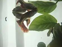 ![]() Ejemplar de guppy macho. Se caracteriza por la aleta anal transformada en gonopodio, su tamaño más pequeño y, especialmente, por las múltiples variedades e intensidades de sus colores, y tienen una aleta inferior a la otra además de las diversas formas de colas (aletas caudales) que pueden tener. | ||