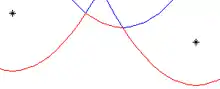 Un segundo evento de la línea de barrido surge cuando un arco se hace tan pequeño que se convierte en un punto. Cuando se presenta esto, las intersecciones que tenía con los otros arcos ( a la izquierda y a la derecha) se juntan. Este encuentro de los puntos de intersección implica que dos aristas del diagrama se están encontrado. En consecuencia, se ha formado un vértice del diagrama de Voronoi. Gráficamente, es el centro de un círculo que pasa por los sitios y correspondientes a y , respectivamente. Cuando alcanza el punto más bajo de este círculo, se ostenta un evento de círculo.