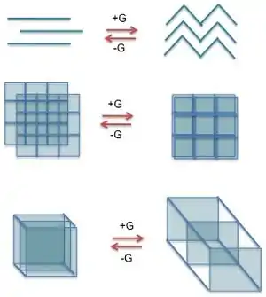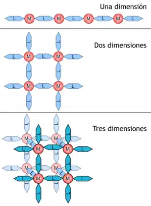 Los polímeros de coordinación pueden clasificarse de varias maneras en función de su estructura y composición. Una clasificación importante es la dimensionalidad. Se puede determinar que una estructura es unidimensional, bidimensional o tridimensional, dependiendo del número de direcciones en el espacio en las que se extienda el conjunto. Una estructura unidimensional se extiende en línea recta (a lo largo del eje x); una estructura bidimensional se extiende en un plano (dos direcciones, ejes x e y); y una estructura tridimensional se extiende en las tres direcciones (ejes x, y y z).[3] Esto se representa en la figura 1.