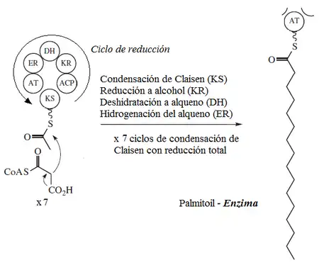- Una unidad de iniciación, la cual es un ácido esterificado a una unidad de Coenzima A; esta molécula se une a la proteína acarreadora de acilos y es la que funciona como aceptora primera del carbanión de acuerdo al mecanismo de la condensación de Claisen