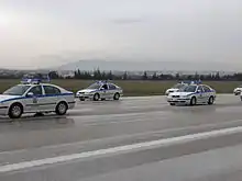 Los vehículos más comunes de la Policía Griega son los Citroën Xsara, Škoda Octavia, Mistubishi Lancer Evolution X, Hyundai i30 y el Citroën C4. Años anteriores fueron utilizados los siguientes modelos:
