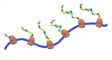 Varios ribosomas sintetizando un polipéptido en la misma cadena de ARN mensajero. La síntesis progresa de izquierda a derecha.