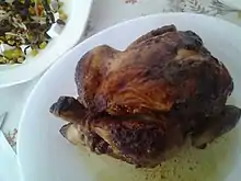 El pollo a la brasa es uno de los platos típicos de la gastronomía peruana y uno de los de mayor consumo, incluso por encima del ceviche, el chifa y las especialidades de la comida rápida.[25][26][27][28][29] Fue considerado una «Especialidad Culinaria del Perú» y «Patrimonio Cultural de la Nación» por el Instituto Nacional de Cultura mediante resolución directoral.[27][30] Debido a su importancia, desde el año 2010, el Instituto Nacional de Estadística e Informática (INEI) incluye el consumo de pollo a la brasa en el cálculo de la canasta básica familiar.[29] Los orígenes de la masificación del plato en el Perú se ubican en el distrito limeño de Chaclacayo durante los años 1950,[26][28][31] cuando su consumo se circunscribía a las clases altas; a partir de aproximadamente los 1970 su popularidad se habría incrementado.[32] En el Perú se ha establecido el tercer domingo de julio de cada año como el Día del Pollo a la Brasa.[33]