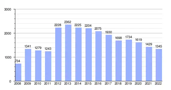 | Gráfica de evolución demográfica de Polopos[6] entre 1842 y 2021 |