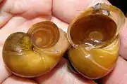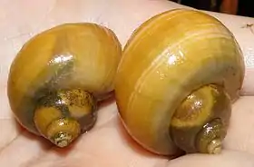 ![]() Caracol manzana (Pomacea diffusa) variedad violeta con amarillo. | ||
