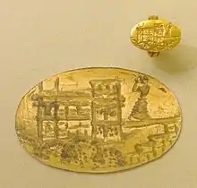 Entre los hallazgos singulares se encuentran dos incensarios,[3] la parte inferior de una estatua femenina con una inscripción en lineal A que pertenece al periodo minoico reciente IIIA,[1] y varios sellos minoicos. Uno de ellos es un anillo de sello con una figura femenina, una masculina y dos aves, que se ha interpretado como un encuentro entre dos divinidades.[4]