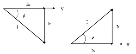 Consideremos un circuito de C. A. en el que la corriente y la tensión tienen un desfase φ. Se define componente activa de la intensidad, Ia, al componente de ésta que está en fase con la tensión, y componente reactiva, Ir, a la que está en cuadratura con ella (véase Figura 1). Sus valores son: