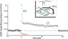 En neurociencia, la potenciación a largo plazo (long-term potentiation, o LTP en inglés) es una intensificación duradera en la transmisión de señales entre dos o más neuronas que resulta de la estimulación sincrónica de ambas.[2] Es uno de los varios fenómenos que subyacen a la plasticidad sináptica, la capacidad de la sinapsis química de cambiar su fuerza. Puesto que se piensa que los recuerdos están codificados por modificaciones de la fuerza sináptica,[3] se considera ampliamente al LTP como uno de los mecanismos celulares principales que subyace al aprendizaje y la memoria.[2][3]