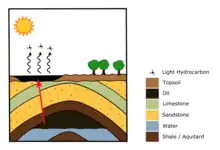 Los pozos de brea se forman por encima de reservas de petróleo, y estos depósitos a menudo se encuentran en trampas anticlinales. De hecho, alrededor del 80 % del petróleo que se encuentra en la Tierra se ha encontrado en trampas anticlinales.[3] Los anticlinales son pliegues en capas estratigráficas en las que cada mitad del pliegue se hunde alejándose de la cresta. Estas estructuras generalmente se desarrollan sobre fallas de empuje o en regiones tectónicas donde la tierra se dobla y se pliega. Si la estructura sobre el pliegue cóncavo hacia abajo (arco) es una roca no porosa o un acuitardo, como el esquisto, se considera una trampa anticlinal.[3] La figura de esta sección es un diagrama de sección transversal de dibujos animados que muestra petróleo atascado en una trampa anticlinal. Si hay una falla o fractura en los estratos suprayacentes sobre la reserva de petróleo, el petróleo puede migrar a la superficie. Esto es posible por una franja capilar y porque el petróleo es menos denso que el agua.[4]