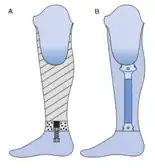 - Pie protésico: existe una variedad importante de pies protésicos, confeccionados en materiales como madera, plástico, goma o fibra de carbono. Se pueden clasificar dentro de cuatro categorías: SACH (solid ankle, cushion hell, que significa tobillo sólido, retropie flexible), monoaxiales, multiaxiales y de respuesta dinámica. La selección del pie protésico está condicionada a factores como la actividad del usuario, el peso, el nivel de amputación, la construcción de la prótesis y el tamaño del pie, entre otros.