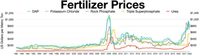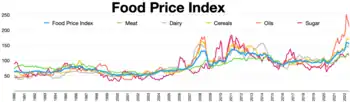 Tras la invasión rusa de Ucrania en 2022, la Organización de las Naciones Unidas para la Alimentación y la Agricultura (FAO), así como otros observadores de los mercados de productos básicos alimentarios, advirtieron sobre un colapso en el suministro de alimentos y aumentos de precios.[31][32][33][34][35] Gran parte de la preocupación está relacionada con la escasez de suministro de cultivos de productos básicos clave, como el trigo, el maíz y las semillas oleaginosas, que podría provocar aumentos de precios.[33] La invasión también provocó aumentos en los precios del combustible y los fertilizantes, lo que provocó más escasez de alimentos y aumentos de precios.[35]