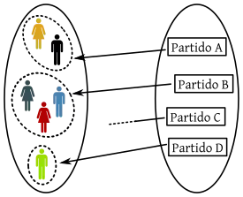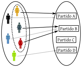 - En el diagrama puede comprobarse que la imagen de la función voto v no coincide con el codominio, ya que el partido C no recibió ningún voto. Sin embargo puede verse que, por ejemplo, v−1(Partido A) tiene 2 elementos.