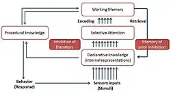 El modelo de inhibición de distractores es el más antiguo y explica el efecto de la preparación negativa como resultado de la atención selectiva a un estímulo diana. Cuando prestamos atención a un estímulo concreto, percibimos otros estímulos que rodean al objetivo como distractores para ayudar a centrarnos. Pero cuando uno de esos distractores se convierte en el nuevo objetivo de la atención, nuestra respuesta al objetivo se ve obstaculizada debido a la inhibición de la memoria inmediata.[5][6] La atención selectiva es la capacidad de responder a un objeto específico cuando hay otros distractores que también compiten por una respuesta. Para explicar esta atención selectiva, el modelo de inhibición del distractor propone un mecanismo dual que implica la excitación para potenciar la señal del objetivo y la inhibición para suprimir los distractores. Esta inhibición se desencadena cuando se produce un desajuste entre las representaciones internas del objetivo y de un distractor. La inhibición de la representación interna del distractor es una forma de ayudar a atender selectivamente al estímulo diana. Esta inhibición decae gradualmente cuando el estímulo ya no está presente para ayudar con el siguiente objetivo. Sin embargo, si un estímulo distractor se vuelve a encontrar como el objetivo, la representación interna del estímulo distractor puede seguir siendo suprimida porque es demasiado pronto para que la decadencia se disipe ya. Esto se denomina inhibición residual transitoria. Esta inhibición también dificulta el procesamiento de una respuesta adecuada al nuevo estímulo diana y provoca un mayor tiempo de reacción.[5][7]
