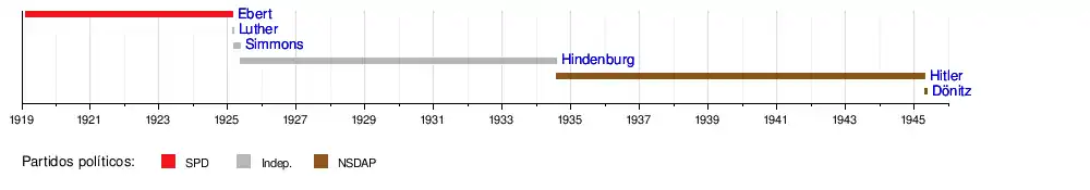 | 1 | ![]() | Friedrich Ebert (1871-1925) | 1919 | 11 de febrero de 1919 | 28 de febrero de 1925 | Murió en el cargo | SPD |