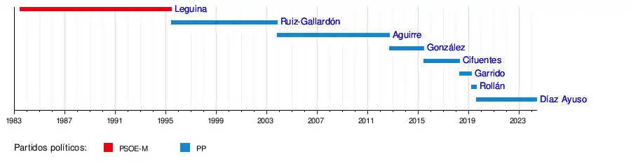 La persona que más tiempo ha estado al frente de la Comunidad de Madrid es el socialista Joaquín Leguina, quien gobernó durante tres legislaturas (12 años), y la que menos, el popular Pedro Rollán, que desempeñó el cargo en funciones cuatro meses. El PSOE ha tenido un presidente y el PP, siete (incluyendo a un interino).