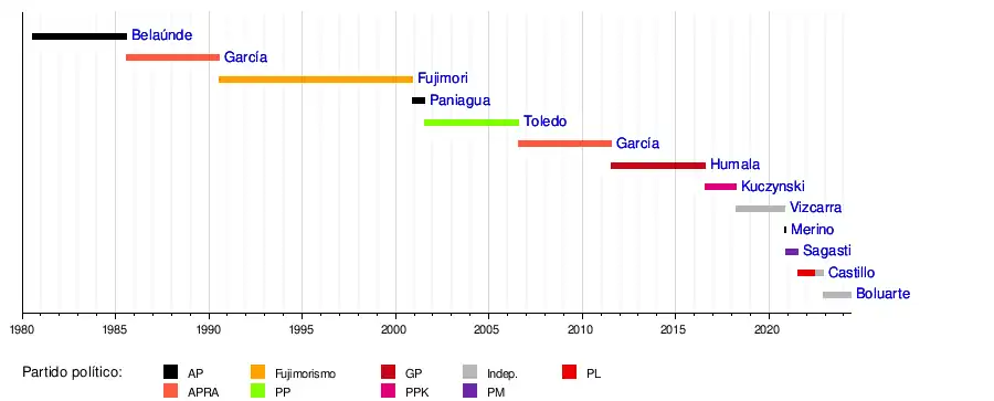 Partido político: Independiente Militar Partido Civil Partido Demócrata Partido Constitucional Partido Democrático Reformista Unión Revolucionaria Coalición Conservadora Frente Democrático Nacional Unión Nacional Odriista Movimiento Democrático Peruano Acción Popular Alianza Popular Revolucionaria Americana Fujimorismo Perú Posible Gana Perú Peruanos Por el Kambio Partido Morado Perú Libre
