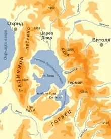 - En la cumbre de Galichica, la cadena montañosa entre Prespa y el lago Ohrid (la fortaleza Vasiliada).[1]