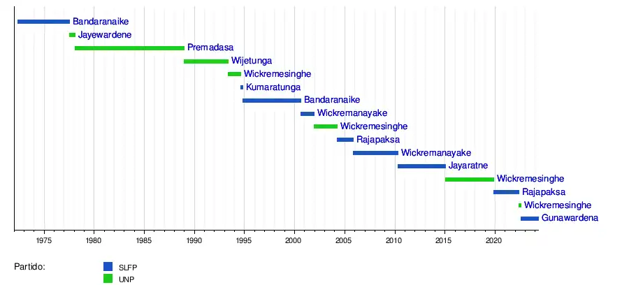 14 de noviembre de 1994 | 9 de agosto de 2000 | Partido de la Libertad de Sri Lanka | C. Kumaratunga (1994-2005) (10) (11) (12) (13) | |||