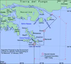 ![]() Consecuencias de la interpretación argentina en la fijación de la frontera, según el almirante Isaac Rojas. Todos los territorios al este del meridiano 67° 16' 03" Sur serían argentinos, incluida la parte oriental de la isla Navarino. |