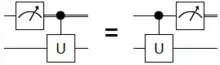 Una medida en una línea de qubit, seguida de operaciones clásicamente controladas en otros qubits, que están controladas por los resultados de la primera medida, es equivalente a las puertas cuánticas controladas correspondientes con una medida al final de la línea.[1]