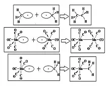 Estos fragmentos pueden ser combinados en moléculas: dos fragmentos CH3 de etano y dos fragmentos de Mn(CO)5 de un complejo formado (CO)5Mn-Mn(CO)5. Más adelante estos fragmentos orgánicos e inorgánicos pueden combinarse para conseguir un complejo H3C-Mn(CO)5. como se muestra en la figura 8.2[7]