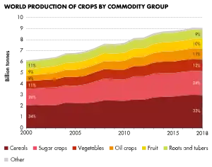 La importancia de un cultivo varía mucho según la región. A nivel mundial, los siguientes cultivos son los que más contribuyen al suministro de alimentos humanos (valores de kcal / persona / día para 2013 entre paréntesis): arroz (541 kcal), trigo (527 kcal), caña de azúcar y otros cultivos azucareros (200 kcal), maíz ( maíz) (147 kcal), aceite de soja (82 kcal), otras verduras (74 kcal), patatas (64 kcal), aceite de palma (52 kcal), yuca (37 kcal), de leguminosas pulsos (37 kcal), aceite de semilla de girasol (35 kcal), aceite de colza y mostaza (34 kcal), otras frutas, (31 kcal), sorgo (28 kcal), mijo (27 kcal), maní (25 kcal), frijoles (23 kcal), batatas (22 kcal), plátanos (21 kcal), frutos secos varios (16 kcal), soja (14 kcal), aceite de semilla de algodón (13 kcal), aceite de maní (13 kcal), ñame (13 kcal).[8] Nótese que muchos de los cultivos aparentemente menores a nivel mundial son muy importantes a nivel regional. Por ejemplo, en África predominan las raíces y los tubérculos con 421 kcal / persona / día, y el sorgo y el mijo aportan 135 kcal y 90 kcal, respectivamente.[8]
