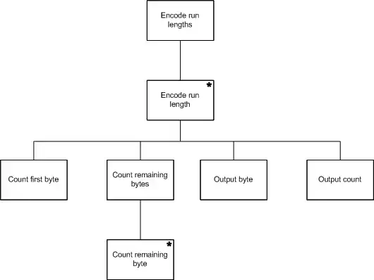 The run length encoder program structureEn esta etapa el programa se puede concretarse en la horca diversas operaciones primitivas fuera de los elementos de la estructura. Primitivos que sugieren mismos son:
