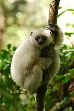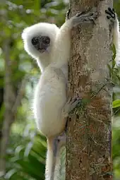 El sifaca sedoso (Propithecus candidus)[3][4] es una especie de primate estrepsirrino de la familia Indriidae. Este lémur se caracteriza por su pelaje blanco, largo y sedoso. Su área de distribución se restringe a una reducida zona del nordeste de Madagascar, donde se le conoce localmente como «simpona». Es uno de los mamíferos más raros de la Tierra, y está incluido en la publicación bienal Los 25 primates en mayor peligro del mundo desde su primera edición en el año 2000. Es una de las nueve especies de sifacas (género Propithecus), y una de las cuatro antiguas subespecies del sifaca diademado (P. diadema); estudios realizados en 2004 y 2007 sobre su genética, comparación de proporciones externas y anatomía craneodental apoyan su consideración como especie separada.