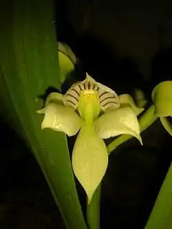 Es una orquídea de tamaño medio, con hábitos de epifita u ocasionalmente terrestres, rizoma rastrero; pseudobulbos laxamente agrupados, fusiformes a ovoides, de 10 cm de largo y 2 cm de ancho, comprimidos, verde pálidos a blanquecinos, cuando jóvenes revestidos con vainas escariosas que se desvanecen, 2-foliados, raras veces 3-foliados. Hojas de 35 cm de largo y 5 cm de ancho, ápice obtuso o retuso, coriáceas, a menudo claras, blanquecinas- o amarillo-verdosas. Inflorescencia 4–10 cm de largo, espata hasta 3 cm de largo, con 3–8 flores verdes hasta verde-blanquecinas, el labelo con 3 rayas centrales cortas y a cada lado desde el centro 5 rayas largas purpúreas en dirección longitudinal, la columna con 2 líneas purpúreas en la base dorsal; sépalos 20 mm de largo, los bordes encorvados, el dorsal 5 mm de ancho, los laterales 7 mm de ancho; pétalos 17 mm de largo y 7 mm de ancho; labelo orbicular, cóncavo, 15 mm de largo y 14 mm de ancho, simple, ápice cortamente apiculado, disco con un callo 6 mm de largo y 3 mm de ancho, blanco en la base, pubescente; columna 7 mm de largo, apicalmente 3-lobada, los lobos laterales más largos y más agudos que el lobo medio; ovario 20 mm de largo, pedicelado.[1]