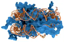 Las proteínas de unión al ADN son proteínas que tienen dominios de unión al ADN y, por lo tanto, tienen una afinidad específica o general por el ADN monocatenario o bicatenario.[3][4][5] Las proteínas de unión a secuencias específicas del ADN generalmente interactúan con el surco mayor del ADN-B, porque expone más grupos funcionales que identifican un par de bases. Sin embargo, existen algunos ligandos de unión al surco menor del ADN conocidos como netropsina,[6] distamicina, Hoechst 33258, pentamidina, DAPI y otros.[7]