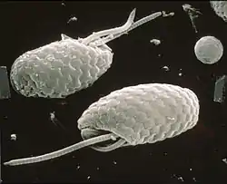 Muchos protistas no tienen partes duras ni esporas resistentes, y sus fósiles son extremadamente raros o desconocidos. Ejemplos de estos grupos incluyen los apicomplejos,[30] la mayoría de los ciliados,[31] algunas algas verdes (las klebsormidiales),[32] coanoflagelados,[33] oomicetos,[34] algas pardas,[35] algas verde amarillentas,[36] Excavata (como los euglenoideos).[37] Algunos de estos se han encontrado conservados en ámbar (resina de árbol fosilizada) o en condiciones inusuales (por ejemplo, Paleoleishmania, un kinetoplástido).