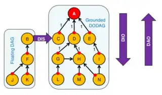 - DIO (objeto de información del DAG): mensaje que comparte información del DAG, enviado como respuesta a mensajes DIS, así como utilizado periódicamente para refrescar la información de los nodos sobre la topología de la red