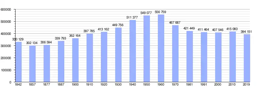 La primera mitad del siglo XX se caracterizó por un crecimiento continuo de la población, pasando de poco más de 300 000 habitantes a casi 560 000 en los años 1960. En las siguientes dos décadas, la población sufre una fuerte caída debido a la gran emigración que se produce hacia zonas más prósperas del país, sobre todo Madrid y Cataluña, perdiendo más de 200 000 habitantes en solo dos décadas.