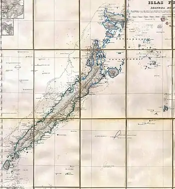 Al oriente de la isla de Paragua, entre esta y la de Panay, está la pequeña, pero famosa isla de Cuyo, la más oriental de esta provincia. Está rodeada de islotes, y se encuentra entre la provincia de Antique y la mencionada isla de Paragua, a unas 27 leguas de Calamianes, 17 de la punta de Tubigón en la de Panay, y a 16 y ½ de la de Dumaran y Simirara. Al lado del noroeste tiene un pequeño puerto. Aunque pequeña, como queda dicho, es notable por su población y por poseer una fortaleza de piedra con buenos baluartes: está bien artillada; fue construida a expensas de sus naturales, y dirigida por los padres Recoletos, encargados de su administración espiritual, a cuyo cargo está la defensa de la misma.[2]