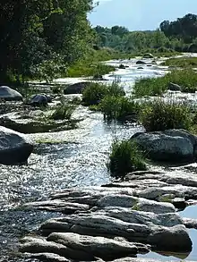 El límite oriental sigue el curso de este río hasta su confluencia con un riachuelo que nace hacia Rozalén: allí toma dirección sureste, atraviesa el río Cigüela y pasa por entre Villamayor de Santiago y Villanueva de Alcardete, la Mota del Cuervo y El Toboso, hasta el noroeste de Pedro Muñoz.[4]