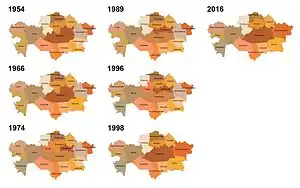 En los últimos 60 años, tanto la distribución como los nombres de las provincias de Kazajistán han cambiado considerablemente. Los principales cambios fueron varias fusiones y escisiones entre Guryev y Mangystau, Karaganda y Dzhezkazgan, Almaty y Taldy-Kurgan, Kazajistán Oriental y Semipalatinsk y Kostanái, Turgay y Tselinograd, respectivamente. Los cambios en los nombres de las provincias coincidieron a menudo con el cambio de nombre de las ciudades, como en el caso de Alma Ata/Almatý. Tras la reforma administrativa de 1997, el último cambio ocurrido desde entonces tuvo lugar en 1999, cuando partes del norte de Kazajistán que originalmente pertenecían a la provincia de Kokshetau pasaron a formar parte de Akmola. Las fusiones de los años 90 se hicieron para diluir la población rusa en la provincia resultante y evitar que hubiera provincias en las que los rusos fueran mayoría.[6]