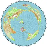 Si el mapa de proyección equidistante acimutal se centra en un punto cuyo punto antípoda se encuentra en tierra y el mapa se extiende a la distancia máxima de 20.000 km (12.427 mi), el punto antípoda se difumina en un gran círculo. Esto se muestra en el ejemplo de dos mapas centrados en Los Ángeles y Taipei. La antípoda de Los Ángeles se encuentra en el sur del Océano Índico, por lo que no hay mucha distorsión significativa de las masas de tierra para el mapa centrado en Los Ángeles, excepto en el este de África y Madagascar. Por otro lado, la antípoda de Taipei está cerca de la frontera entre Argentina y Paraguay, lo que hace que el mapa centrado en Taipei distorsione severamente América del Sur.
