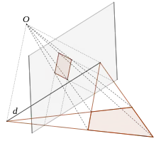 ![]() Homografía de punto fijo vista como una proyección central, en el caso de un punto enviado al infinito |