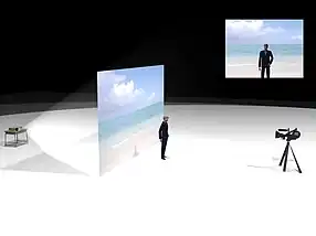 Los actores se paran frente a una pantalla mientras un proyector colocado detrás de la pantalla proyecta una imagen invertida del fondo. Esto requiere un gran espacio, ya que el proyector debe colocarse a cierta distancia de la parte posterior de la pantalla. Con frecuencia, la imagen de fondo puede aparecer inicialmente débil y desvaída en comparación con el primer plano y puede ser tanto fija como en movimiento.[6]