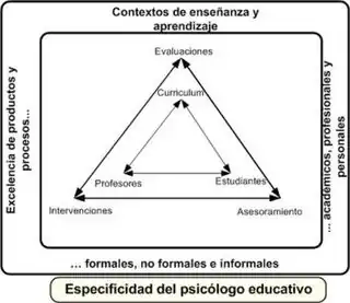 Lo que determina la especificidad del psicólogo educativo, frente al resto de colegas psicólogos y a otros especialistas, viene constituido por un triángulo académico en cuyos vértices aparecen tres categorías: profesores, alumnos y currículos (ver gráfico). En los tres casos, el plural significa que se asume tanto su sentido estricto (concepción oficial clásica) como el más general (el propio de una sociedad de la información y del conocimiento como la actual). Además, el plural también nos indica que en nuestros días ya no se considera sin más al alumno o al profesor promedio o al currículo cerrado, cuanto la enorme variabilidad dentro del profesorado, del alumnado y de los currículos. El triángulo une sus ángulos mediante flechas bidireccionales, lo que nos indica que se están considerando ya cuádruples tipologías frente a los tradicionales binomios (profesor/alumno). Así, nos encontramos, en los diversos ámbitos educativos, con grupos de buenos profesores y alumnos (excelente enseñanza/aprendizaje); grupos de buenos profesores pero malos alumnos y grupos de malos profesores y buenos alumnos (en ambos casos, grados medios en los procesos/productos de enseñanza/aprendizaje); y grupos de malos profesores y alumnos (fracaso general en los procesos/productos de enseñanza-aprendizaje).