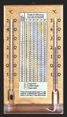 | Psicrómetro incluyendo una tabla de doble entrada (temperatura «seca» a la izquierda, y diferencia de temperatura arriba), que permite conocer la humedad relativa del aire a partir de estos dos datos. | Psicrómetro de una estación meteorológica, con los dos termómetros (seco y húmedo) situados en la parte derecha de la imagen. | Psicrómetro de Assmann de circulación forzada de aire. |