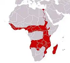Se encuentra en Angola, Botsuana, Camerún, República Centroafricana, República Democrática del Congo, Costa de Marfil, Egipto, Guinea Ecuatorial, Etiopía, Gabón, Ghana, Guinea, Guinea-Bissau, Kenia, Liberia, Madagascar, Malaui, Mauricio, Mozambique, Namibia, Nigeria, Ruanda, Reunión, Senegal, Seychelles, Sierra Leona, Sudáfrica, Sudán, Tanzania, Zambia y Zimbabue.