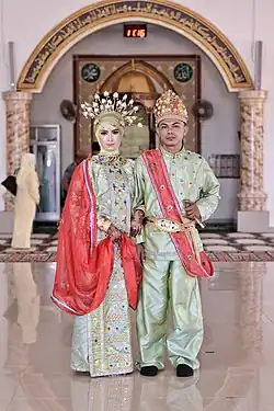 - Costumbres nupciales de Momonto y Modutu. En las costumbres nupciales tradicionales del pueblo Gorontalo, existen pocas normas y procedimientos que deben ser llevados a cabo tanto por la novia como por el novio. La gente de Gorontalo todavía se aferra a las tradiciones generacionales como parte de sus costumbres y cultura. La ceremonia de la boda se lleva a cabo alternativamente tanto en la casa de la novia como en la del novio. Puede durar más de dos días. Los familiares trabajarán juntos en la preparación de la ceremonia de la boda durante unos días antes del día de la boda. Tanto la novia como el novio se vestirán con el atuendo tradicional, bili'u. El dormitorio nupcial se utiliza durante la recepción de la boda de acuerdo con las costumbres de Gorontalo.[47][48][49]