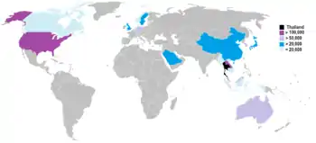 La gran mayoría de los tailandeses viven en Tailandia, aunque también se pueden encontrar algunos tailandeses en otras partes del sudeste asiático . Alrededor de 51 a 57 millones viven solo en Tailandia,[25] mientras que también se pueden encontrar grandes comunidades en los Estados Unidos, China, Laos, Taiwán, Malasia, Singapur, Camboya, Birmania, Corea del Sur, Alemania, el Reino Unido, Canadá, Australia, Suecia, Noruega, Libia y los Emiratos Árabes Unidos .