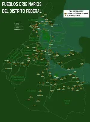 Los pueblos originarios son aquellas localidades que históricamente se desarrollaron de manera independiente a la Ciudad de México, pero que han sido absorbidas por ella, como consecuencia del crecimiento de la metrópoli. La mayor parte de estas comunidades tienen su origen en la época prehispánica, y fueron fundados por grupos de filiación otomangue —como los otomíes, y matlatzincas— y nahua. En la actualidad, la mayoría de los pueblos originarios poseen topónimos de origen náhuatl, aunque en muchos de ellos se hablaba otomí, mazahua y matlatzinca en el momento de la Conquista.