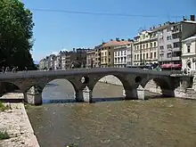 El puente tiene cuatro arcos y se apoya en tres fuertes pilares y el dique; está construido de piedra y yeso y sus dos aperturas ("ojos") encima de los pilares son tan característicos que aparecen en el escudo de Sarajevo. Debido al fuerte tráfico en la época del Imperio Austro-Húngaro, se añadieron al puente las aceras.